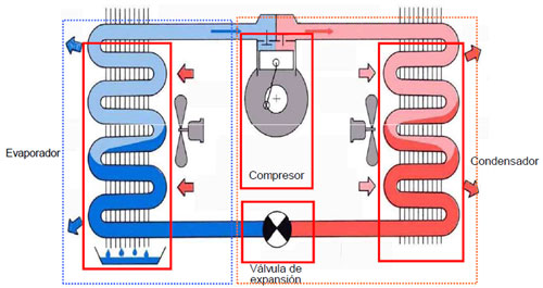 La unidad de secado con bomba de calor de alta temperatura se compone principalmente de cuatro partes: evaporador (máquina exterior), compresor, condensador (máquina interior) y válvula de expansión. El refrigerante se evapora continuamente (absorbe el calor del ambiente exterior) → compresión → condensación (el calor se libera en la sala de secado interior) → estrangulamiento → proceso de ciclo térmico de reevaporación, transfiriendo así el calor en el ambiente externo de baja temperatura a la sala de secado, y el refrigerante circula en el sistema bajo la acción del compresor.